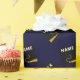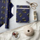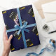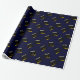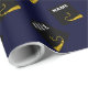 Papel de embrulho exclusivo para presente de formatura com capa de graduado preta e dourada em fundo azul marinho. Edite o texto para adicionar o nome do graduado e o ano da turma de formandos.