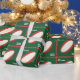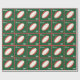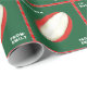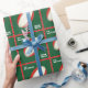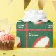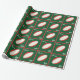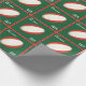 Design de embrulho de presente de Natal de Rugby com bola de rúgbi vermelha e branca em fundo verde. Para personalizar editar texto para adicionar nomes.