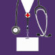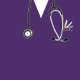Embrulho de presente criativo para enfermeira com design de parabéns com ilustração de jaleco hospitalar roxo e estetoscópio. Edite o texto para adicionar o nome da enfermeira.