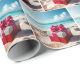 Uma bela caixa de presentes embrulhada com um arco vermelho vibrante sentado numa praia arenosa contra o pano de fundo das ondas turquesas do oceano e um céu azul