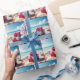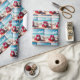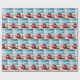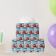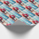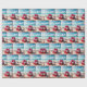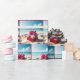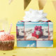Uma bela caixa de presentes embrulhada com um arco vermelho vibrante sentado numa praia arenosa contra o pano de fundo das ondas turquesas do oceano e um céu azul