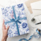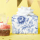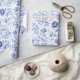 Um belo padrão floral toile azul e branco neste papel de embrulho. Perfeito para Aniversários, Chás de Bebê, Chás de Noiva e Casamentos.