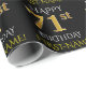 Este design de papel de embrulho apresenta uma mensagem como "FELIZ 71rua ANIVERSÁRIO", com a "71ruas" com aparência falsa/imitação de ouro. Ele também apresenta um nome que pode ser personalizado e um fundo preto colorido. Talvez possa ser utilizado quando se dá presentes para o 71º aniversário de alguém. [~Z0000130]