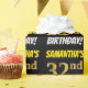 Este design de papel de embrulho apresenta uma mensagem como "SAMANTHA'S 32nd BIRTHDAY!", com o "32º" a ter uma aparência falsa/imitada de cor dourada, e com o nome e "BIRTHDAY" numa fonte divertida e ousada. O nome pode ser personalizado e o fundo é preto colorido. Um papel de embrulho como este poderia talvez ser usado para embrulhar presentes de aniversário que são dados a alguém em comemoração de seus trinta e dois anos. [~Z0000203]