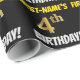 Este design de papel de empacotamento apresenta uma mensagem como "PRIMEIRO NOME DO 4º ANIVERSÁRIO!", com o "4º" a ter uma aparência falsa/imitada de cor dourada, e com o nome e "ANIVERSÁRIO" numa fonte divertida e ousada. O nome é personalizável e o fundo é preto colorido. Um papel de embrulho como este poderia talvez ser usado no embrulho de presentes de aniversário que são dados a alguém em comemoração do seu quarto aniversário. [~Z0000203]