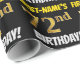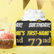 Este design de papel de empacotamento apresenta uma mensagem como "PRIMEIRO NOME'S 72nd BIRTHDAY!", com o "72º" a ter uma aparência de cor falsa/imitada em forma de ouro, e com o nome e "BIRTHDAY" numa fonte divertida e ousada. O nome é personalizável e o fundo é preto colorido. Um papel de embrulho como este poderia talvez ser usado no embrulho de presentes de aniversário que são dados a alguém em comemoração de seus setenta e dois anos. [~Z0000203]