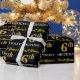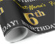 Este design de papel de embrulho apresenta uma mensagem como "First-Name’s 6 BIRTHDAY!", com o "6" a ter uma aparência falsa/de cor dourada. O nome pode ser personalizado e o fundo é preto colorido. Talvez possa ser utilizada quando se dá presentes para o sexto aniversário de alguém. [~Z0000177]