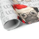 Este adorável cão Pug está vestido para a temporada de férias num cachecol vermelho e preto listrado de inverno com o chapéu de Papai Noel, e senta-se contra um fundo de arte macio de palavras.