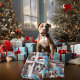 Um pãozinho terrível de Pitbull Azul e Branco com um pequeno chapéu de Papai Noel na sua cabeça grande de seu corpo, e um com fita vermelha no pescoço, tudo sobre fundo azul claro, com presentes e flocos de neve... o maior papel para enrolar seus presentes neste ano, um deve ter para as famílias de pitbulas ou qualquer amante de cachorro - A © WhimsicalArtwork™ original -