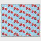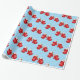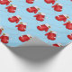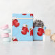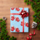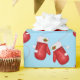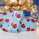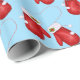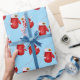 Papel de embrulho de presente de Natal mostrado com um impressão de luvas de Natal giras em fundo azul.