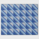 Feche a fotografia do padrão de crochê em faixas de branco, cinza e tons de azul. O azul escuro é predominante. O padrão está na diagonal com bandas azuis claras que combinam em cantos opostos.