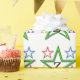 Estrelas coloridas são ladeadas sobre o papel. Personalize com o Black inicial no centro de grande estrela verde. Estrelas menores em vermelho, azul, amarelo e roxo flutuam em torno da grande estrela. Todas as estrelas são criadas com um contorno de fio de 3 d.