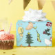Galinhas de férias fantasiadas de chapéus e lenços, rodeadas de muitas guloseimas e bondade.