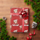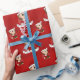 Papel de embrulho com ilustração de uma menina sorridente e fofinha de cabelo castanho longo, a menina está vestindo uma fantasia de Santa Cláusula com um chapéu vermelho e segurando um presente; em um círculo vermelho sobre fundo vermelho, com um modelo de texto personalizável para seu nome ou mensagem