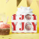 Alegria Vermelha com bagas Fotos de Natal Papel de Moldagem. Mostra um padrão da palavra "JOY" em vermelho com bagas vermelhas e verde enquanto em vez da letra "O" está sua foto. Personalize com sua própria foto e texto.