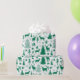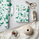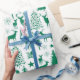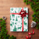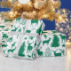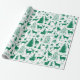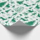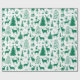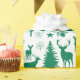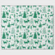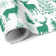 Papel de embrulho de inverno que apresenta um padrão de renas verdes numa floresta florestal de árvores em silhueta de cor branca.