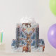 Rena festiva com galhadas brilhantes e um arco vermelho, em uma vila nevada cercada por pinheiros — perfeita para adicionar calor e charme de férias!