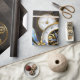 Marcações antigas com engrenagens de ouro e latão, decoradas com libélula mecânica sobre fundo castanho e listrado. Steampunk.