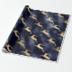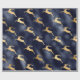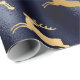 Um papel festivo e colorido, azul e dourado, de embrulho de Natal, com um padrão de renas ouros sobre um fundo azul brilhante. Perfeito para o seu presente de Natal precisa desta época festiva. Pegue o seu hoje!