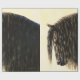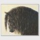 Cavalo Negro da Frísia com um homem longo e ondulado mostrando os realces amarelos quentes do sol da tarde.