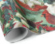 Pai Natal rodeado de verde, com flores, anjos, crianças e ornamentos em vermelhos brilhantes e verdes.