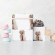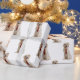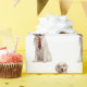 Ouro bonito Retriever com óculos pretos e gravata riscada em fundo branco. A cor de fundo pode ser alterada.