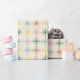 Envolva presentes em estilo com este papel de embrulho e o seu padrão floral de estilo de vintage. Representações geométricas de margaridas em tons mudos de azul claro, verde escuro, rosa, laranja feroz e amarelo são colocadas sobre uma areia ou fundo colorido bege para um olhar simples e retrô.