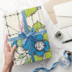 Cheerful blue flowers with bright green leaves on a cream tile grid background. This vintage-inspired pattern combines bold graphic florals with a distressed tile texture for a retro kitchen or cottage style feel. The fresh blue-green-cream palette brings springtime energy perfect for garden parties, kitchen gifts, and nostalgic designs.