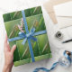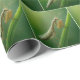 Uma visão de perto mostra um louva-deus orando empoleirado em uma folha verde de grama, destacando seus detalhes complexos e sua camuflagem natural