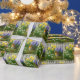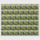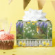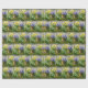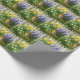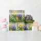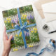 Robin is standing in a garden with spring daffodils, snowdrops, and purple hyacinth flowering plants, with a white wooden picket fence