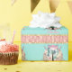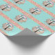 Apresenta uma joia decorada floral em rosa e creme com um arco azul no pescoço. Ela é colocada sobre um fundo azul que é aparado com fita rosa e dourada. Pronto para personalizar.