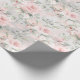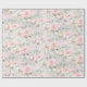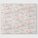 Um papel de embalagem, cor-de-água, cor-de-rosa, cor-de-rosa esbranquiçada, com grandes rosas cor-de-rosa e verde-prateado eucalipto.