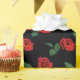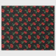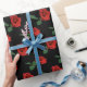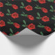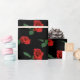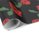 Este elegante papel de embrulho apresenta um padrão de abstrato repetido de uma rosa vermelha solteiro com folhas verdes sobre fundo preto puro.