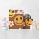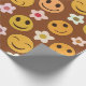 Este é um rostos alegres e cor de laranja e amarelo sorridente com flores retrorreflectoras em fundo castanho escuro.