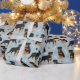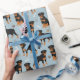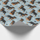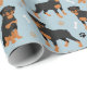 Cute Rottweiler dogs sit and stand with black and tan coats with scattered dog bones and pawprints pattern.