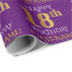 Este design de papel de embrulho apresenta uma mensagem como "FELIZ 18º ANIVERSÁRIO", com o "18º" a ter uma aparência falsa/imitação de ouro. Ele também apresenta um nome que pode ser personalizado, e um fundo de cor roxa. Talvez possa ser utilizada quando se dá presentes para o décimo oitavo aniversário de alguém. [~Z0000134]