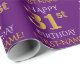 Este design de papel de embrulho apresenta uma mensagem como "FELIZ 31º ANIVERSÁRIO", com o "31º" a ter uma aparência falsa/imitação de ouro. Ele também apresenta um nome que pode ser personalizado, e um fundo de cor roxa. Talvez possa ser utilizada quando se dá presentes para o trigésimo primeiro aniversário de alguém. [~Z0000134]