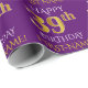 Este design de papel de embrulho apresenta uma mensagem como "FELIZ 39º ANIVERSÁRIO", com o "39º" a ter uma aparência falsa/imitação de ouro. Ele também apresenta um nome personalizado, e um fundo de cor roxa. Talvez possa ser utilizado quando se dá presentes para o trigésimo nono aniversário de alguém. [~Z0000134]
