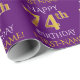 Este design de papel de embrulho apresenta uma mensagem como "FELIZ 74º ANIVERSÁRIO", com o "74º" a ter uma aparência falsa/imitação de ouro. Ele também apresenta um nome que pode ser personalizado, e um fundo de cor roxa. Talvez possa ser utilizado quando se dá presentes para o setenta e quatro anos de alguém. [~Z0000134]