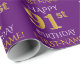 Este design de papel de embrulho apresenta uma mensagem como "FELIZ 91rua ANIVERSÁRIO", com a "91ruas" com aparência falsa/imitação de ouro. Ele também apresenta um nome que pode ser personalizado e um fundo de cor roxa. Talvez possa ser utilizado quando se dá presentes para o nonagésimo primeiro aniversário de alguém. [~Z0000134]