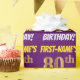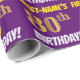 Este design de papel de embrulho apresenta uma mensagem como "PRIMEIRO NOME DO 80 DE ANIVERSÁRIO!", com o "80" a ter uma aparência falsa/imitada de cor dourada, e com o nome e "ANIVERSÁRIO" numa letra divertida e ousada. O nome pode ser personalizado, e o fundo é roxo colorido. Um papel de embrulho como este poderia talvez ser usado no embrulho de presentes de aniversário que são dados a alguém para celebrar o seu oitavo aniversário. [~Z0000206]