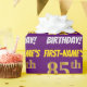 Este design de papel de empacotamento apresenta uma mensagem como "PRIMEIRO NOME'S 85º ANIVERSÁRIO!", com o "85º" a ter uma aparência falsa/imitada de cor dourada, e com o nome e "ANIVERSÁRIO" numa fonte divertida e ousada. O nome pode ser personalizado, e o fundo é roxo colorido. Um papel de embrulho como este poderia talvez ser usado no embrulho de presentes de aniversário que estão sendo dados a alguém em comemoração de seu oitenta aniversário. [~Z0000206]