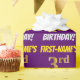 Este design de papel de embrulho apresenta uma mensagem como "aniversário de 3 anos do NOME PRIMEIRO!", com o "3º" a ter uma aparência falsa/imitada de cor dourada, e com o nome e o "BIRTHDAY" numa fonte divertida e ousada. O nome pode ser personalizado, e o fundo é roxo colorido. Um papel embrulhante como este poderia talvez ser usado no empacotamento de presentes de aniversário que são dados a alguém em comemoração do seu terceiro aniversário. [~Z0000206]