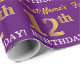 Este design de papel de embrulho apresenta uma mensagem como "First-Name’s 12 BIRTHDAY!", com o "12" a ter uma aparência falsa/de cor dourada. O nome pode ser personalizado e o fundo é roxo colorido. Talvez possa ser utilizado quando se dá presentes para o décimo segundo aniversário de alguém. [~Z0000182]