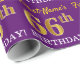 Este design de papel de embrulho apresenta uma mensagem como "First-Name’s 66th BIRTHDAY!", com o "66º" com aparência falsa/imitação de cor dourada. O nome pode ser personalizado, e o fundo é roxo colorido. Talvez possa ser utilizada quando se dá presentes para o sexagésimo sexto aniversário de alguém. [~Z0000182]