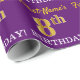Este design de papel de embrulho apresenta uma mensagem como "First-Name’s 8th BIRTHDAY!", com o "8º" a ter uma aparência falsa e imitada de cor dourada. O nome pode ser personalizado e o fundo é roxo colorido. Talvez possa ser utilizada quando se trata de dar presentes para o oitavo aniversário de alguém. [~Z0000182]