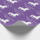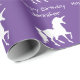 Papel de envolvimento bonito roxo personalizado do aniversário das meninas do teste padrão do unicórnio. Silhuetas brancas do unicórnio em um fundo roxo brilhante. PERSONALIZE para mudar a cor roxa a toda a outra cor. O texto lê "o FELIZ ANIVERSARIO" e o nome. Edite para personalizar para uma festa de aniversário temático do unicórnio do divertimento. Teste padrão lunático bonito do unicórnio.