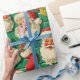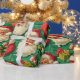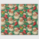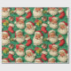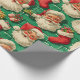 Este papel de embrulho festivo apresenta um padrão repetitivo de imagens clássicas de Natal num fundo texturizado, verde médio que se assemelha a um tijolo ou parede de stuco. Os principais elementos do design são: Faces de Papai Noel: Numerosas representações da cabeça de Papai Noel, cada uma com um rosto rosado, uma barba branca lisa e um chapéu vermelho tradicional de Papai Noel com uma brim branca e pom-pom. Suas expressões variam ligeiramente, mas todas transmitem calor e alegria. Meias de Natal: Meias de Natal vermelhas e brilhantes com algemas brancas são intercaladas ao longo do padrão. Alguns parecem ser cheios, apontando presentes dentro. Caixas para presentes: As caixas para presentes pequenas e quadradas embrulhadas em papel dourado com arcos vermelhos também fazem parte do design de repetição. O arranjo destes elementos é de certo modo desfasado e sobreposto, criando um padrão denso e vivo. As cores são tradicionais e vibrantes, fazer ideal para o presente de Natal. A estética geral é alegre e nostálgica, perfeita para capturar o espírito do Natal.