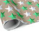Um papel kraft rústico para o feriado de Natal, com estrelas brancas brilhantes e verdes e prateadas em padrão repetido num papel kraft quente.