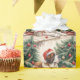 A cozy watercolor illustration of a Saint Bernard wearing a festive Santa hat, resting beside a decorated Christmas tree and wrapped gifts. Soft winter light, traditional holiday colors, and detailed brushwork create a warm, timeless scene that feels comforting and refined. Perfect for dog lovers and classic holiday gift wrapping that adds charm without overwhelming the presentation.